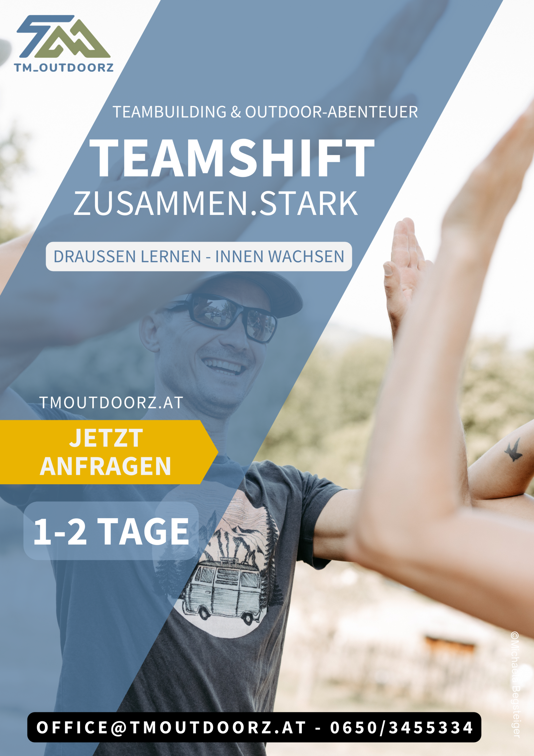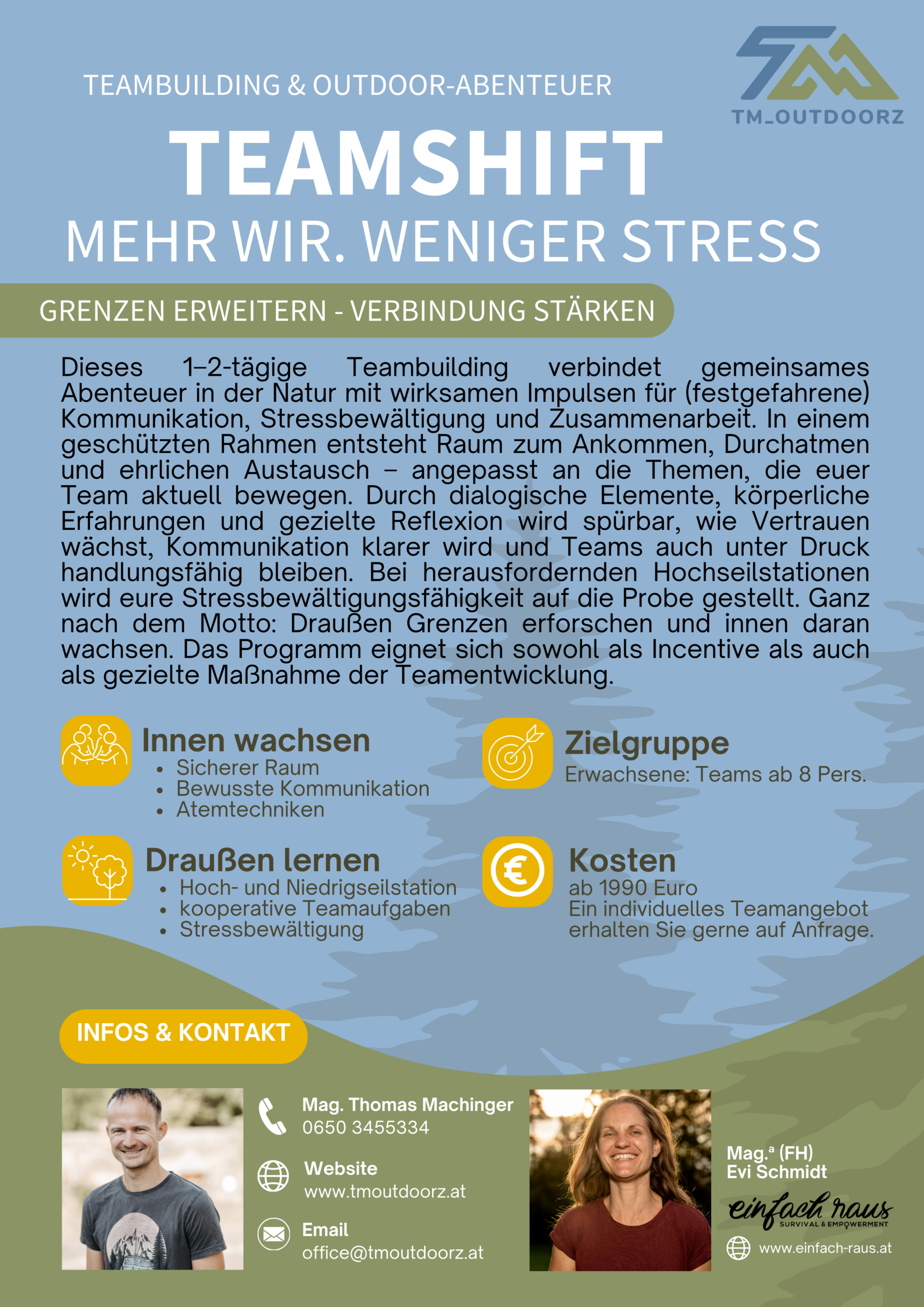 Dieses 1–2-tägige Teambuilding in Kooperation mit Thomas Macher von TM Outdoorz verbindet gemeinsames Abenteuer in der Natur mit wirksamen Impulsen für (festgefahrene) Kommunikation, Stressbewältigung und Zusammenarbeit. In einem geschützten Rahmen entsteht Raum zum Ankommen, Durchatmen und ehrlichen Austausch – angepasst an die Themen, die euer Team aktuell bewegen.